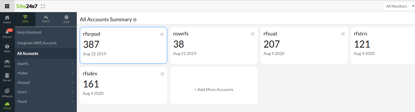 There is inconsistency between the number of monitors displayed per AWS account at "All accounts" level view and the individual account level view. In my case at All accounts level it displays I have 387 monitors for my rfsprod account, whereas when I click on rfsprod account, in the inventory dashboard it shows, I only have 356 monitors for the same account (see the attached screenshots). What a confusing message!