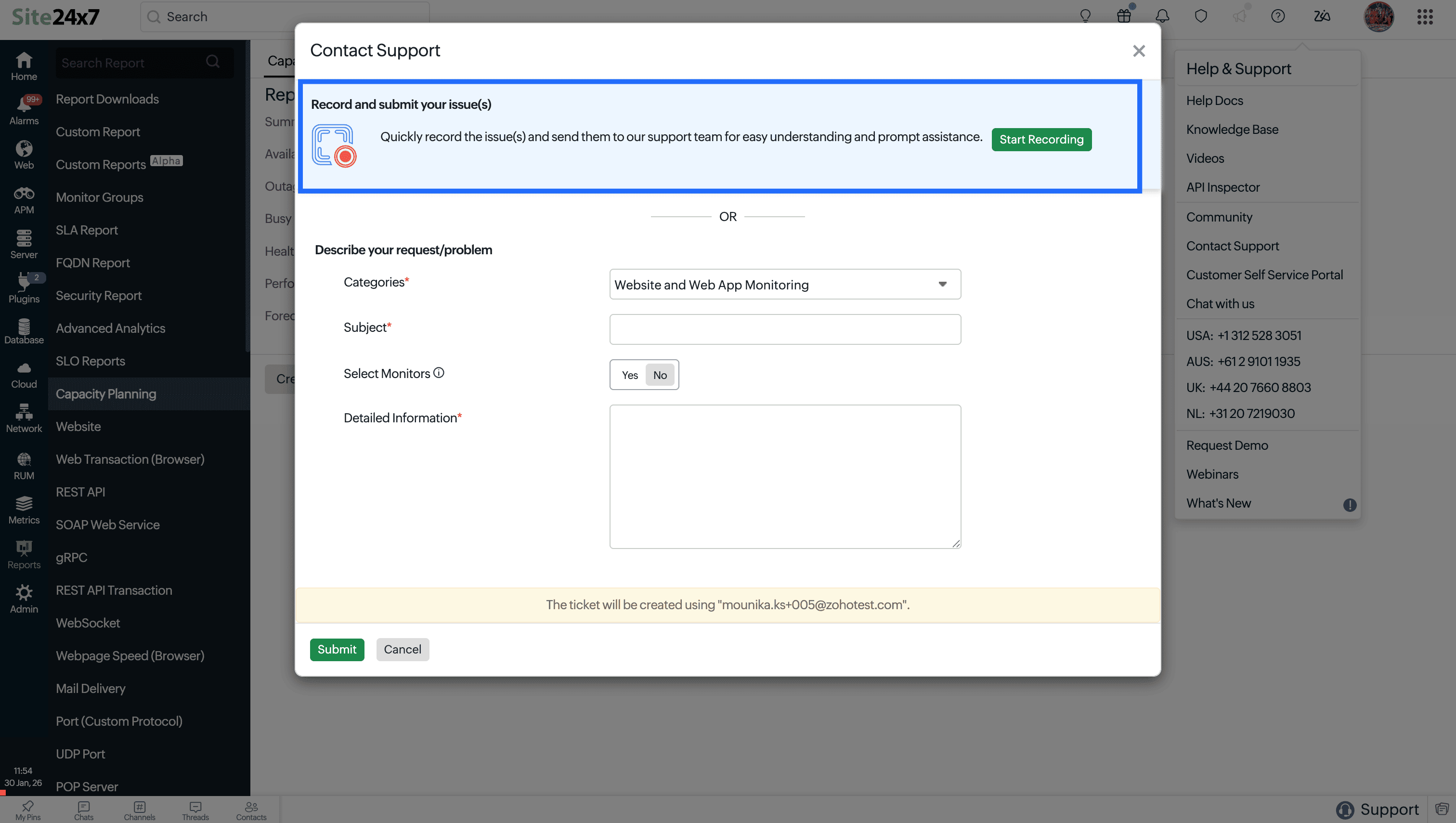 You can also reach the Site24x7 support team by emailing support@site24x7.com with your question and relevant details. Our support team will review your request and respond promptly to help resolve your issue.