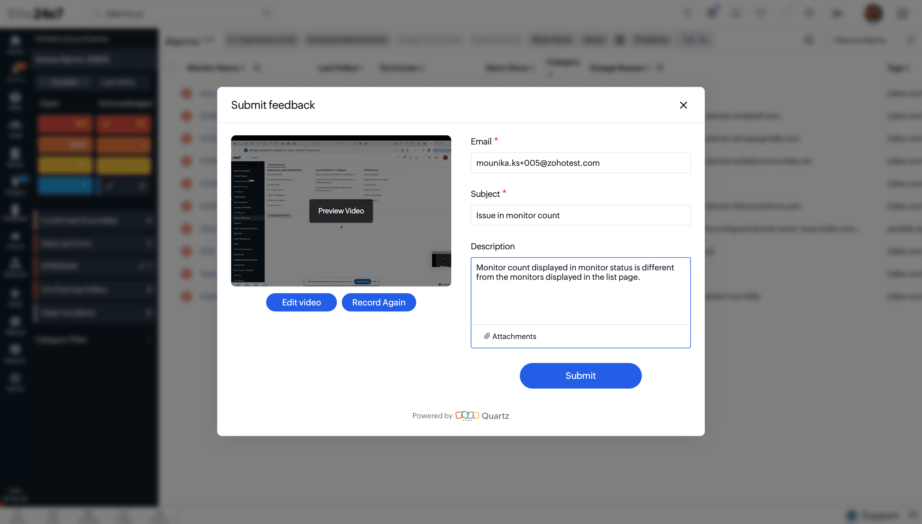 6. Once the recording is complete, in the Submit feedback pop-up, you can review the recorded video, edit it, or rerecord it. Fill out the fields to provide more clarity on the issue.