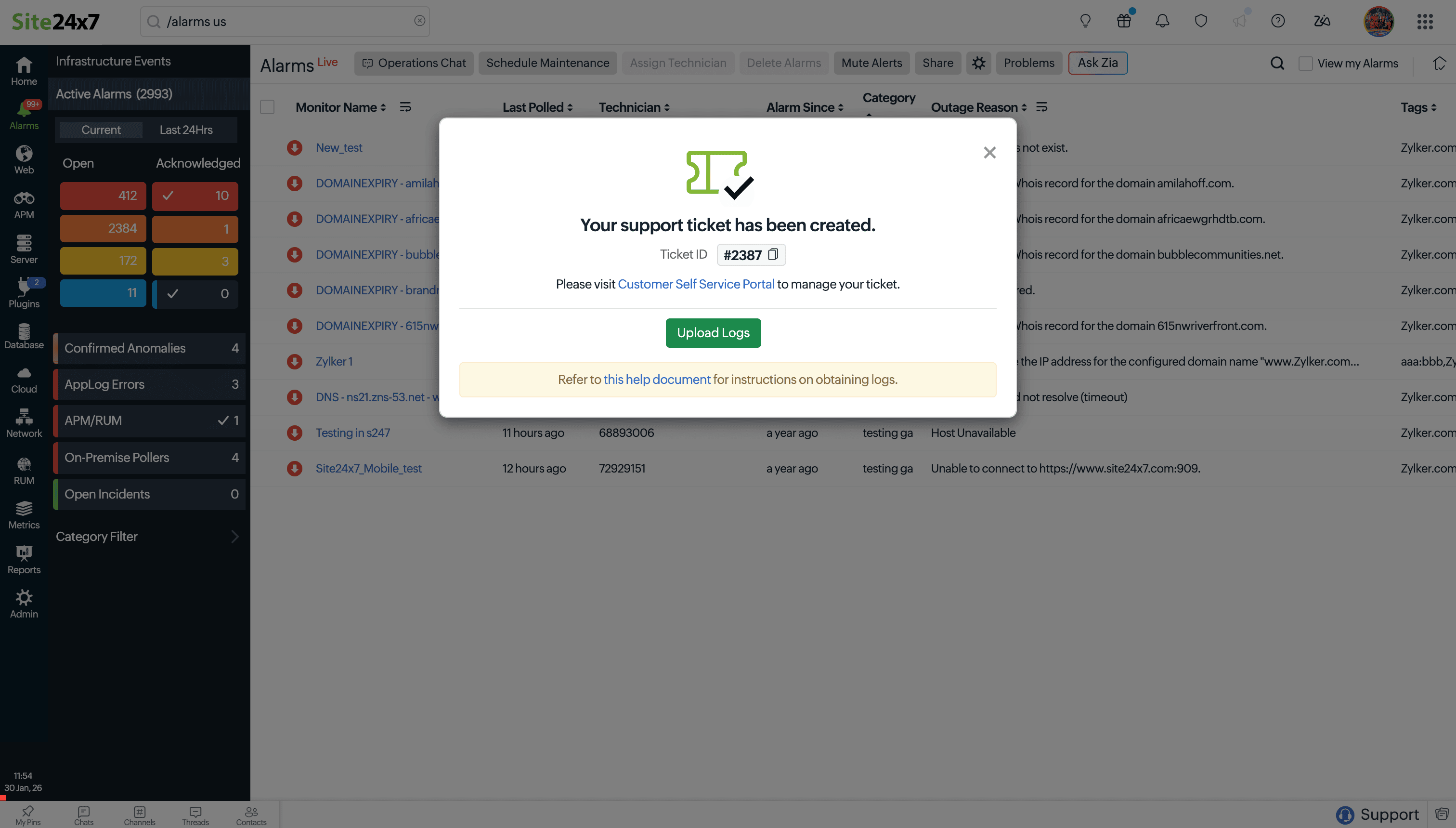 3. A confirmation pop-up with the ticket ID will be displayed, allowing you to track and follow up on your support request at any time. Here, click Upload Logs to attach supporting log details.