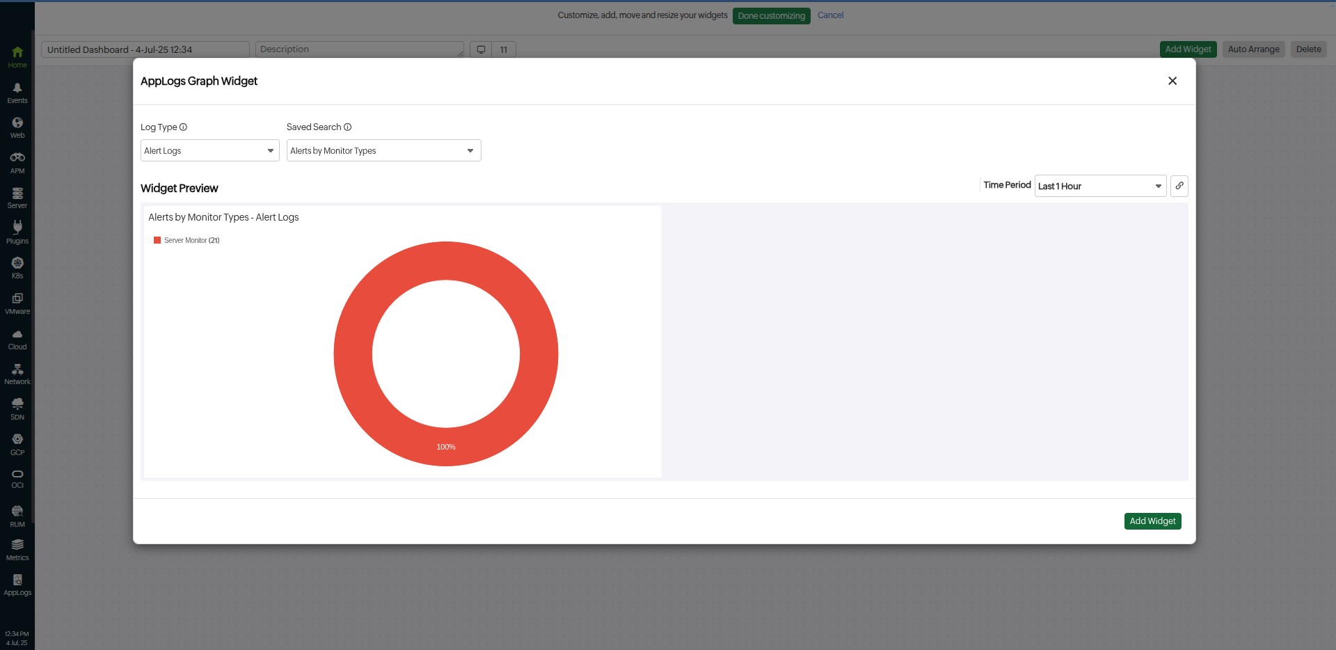 6. In the Add Widget pop-up, select log type as Alert Logs.
