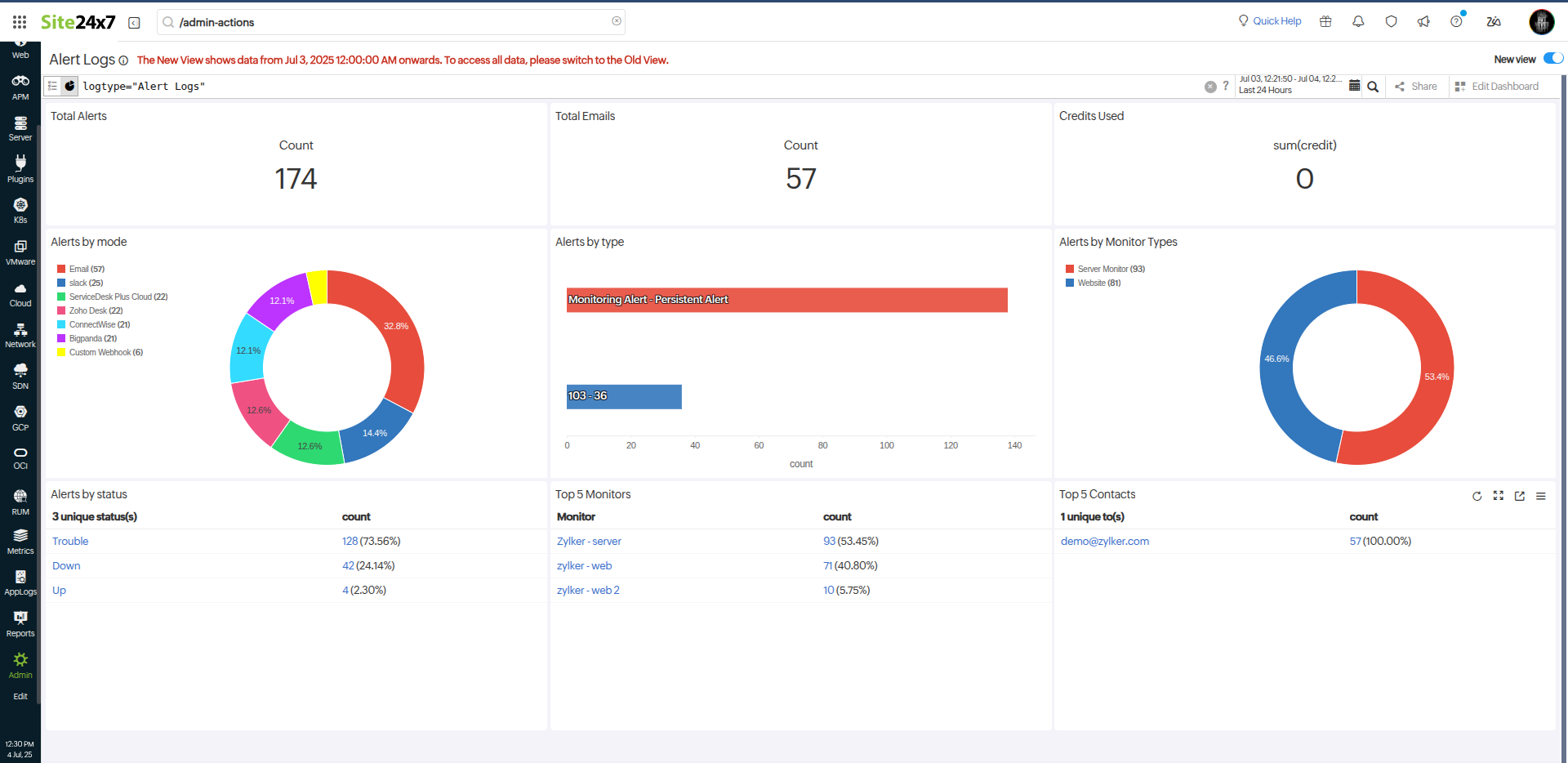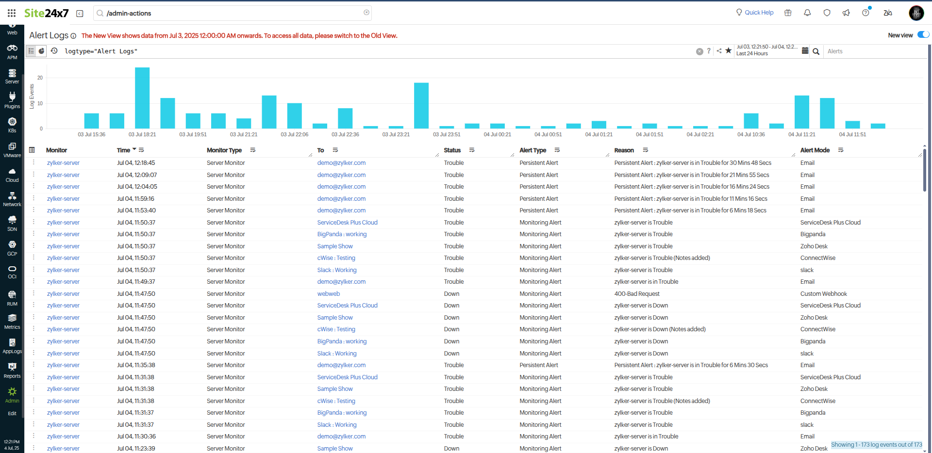 Gain a comprehensive overview of all alerts generated by Site24x7 using the Alert Logs. Easily track key details such as the monitored resource name, alert trigger time, root cause, and notification status. With the enhanced view, you can filter the alert logs by monitor type, outages, alarms, and so on. Toggle the New view to access enhanced filtering, customizable layouts, and deeper visibility into your alert data.