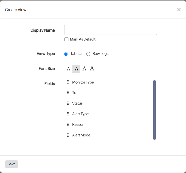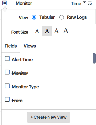 Here, you can switch between two views—Tabular and Raw Logs (logs in JSON format), and also select from four different Font Sizes. Click +Create New View to customize and set a default view for alert logs.