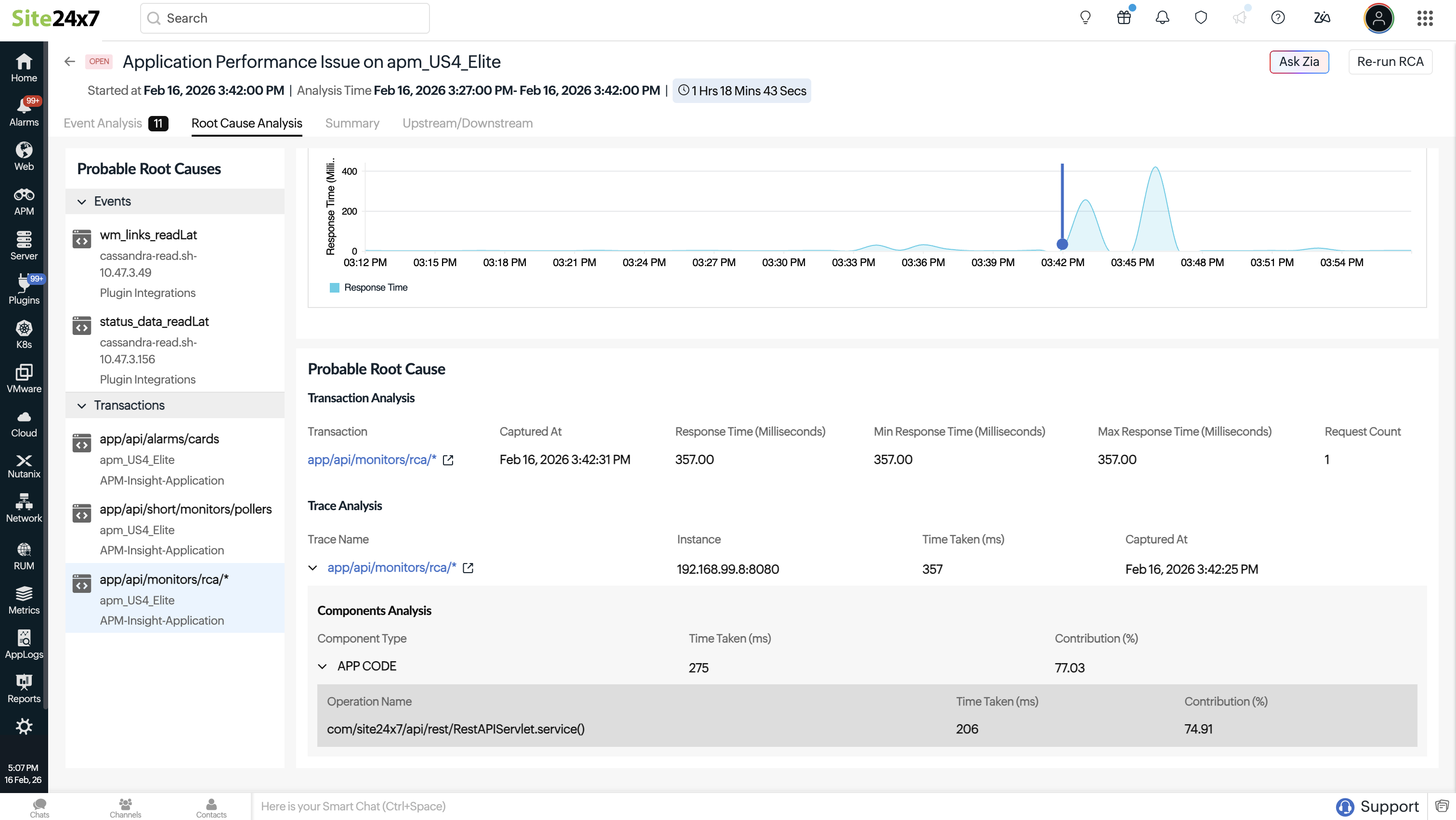This section typically presents a list of probable root causes, such as transactions or application components that showed signifi cant deviation from normal behavior. Selecting a probable cause reveals contextual details including the affected monitor, monitor type, and the specific metric that contributed to the Problem.