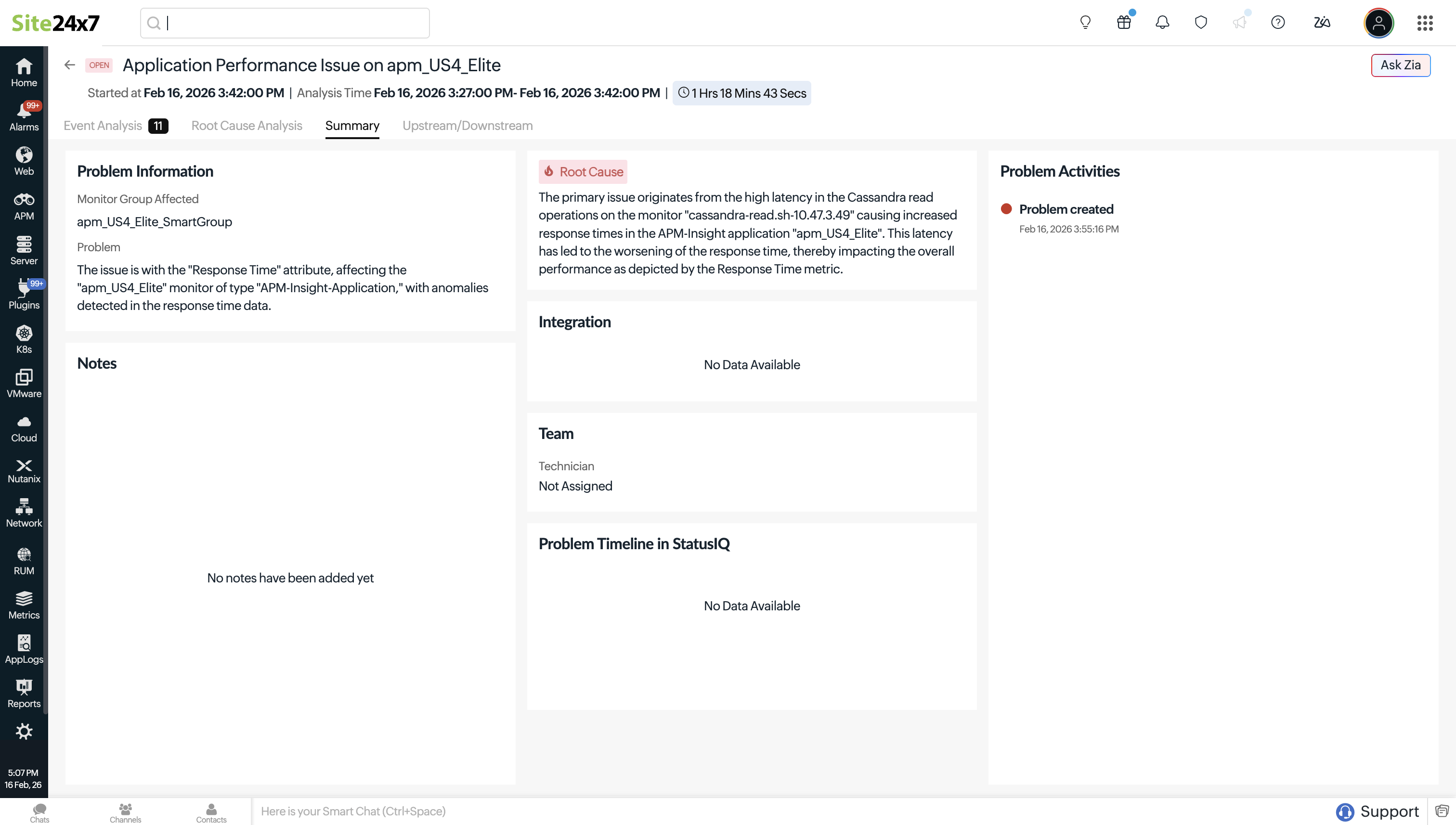 This pattern is identified by Site24x7 and related events are correlated into a single consolidated Problem. Along with event correlation, Problems expose a set of probable root cause events, help assess impacted components, and enable prioritization of resolution.