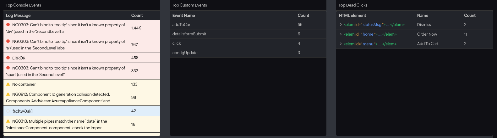 - Log Message: The content of the console log messages, such as warnings and errors, that were recorded during user sessions.