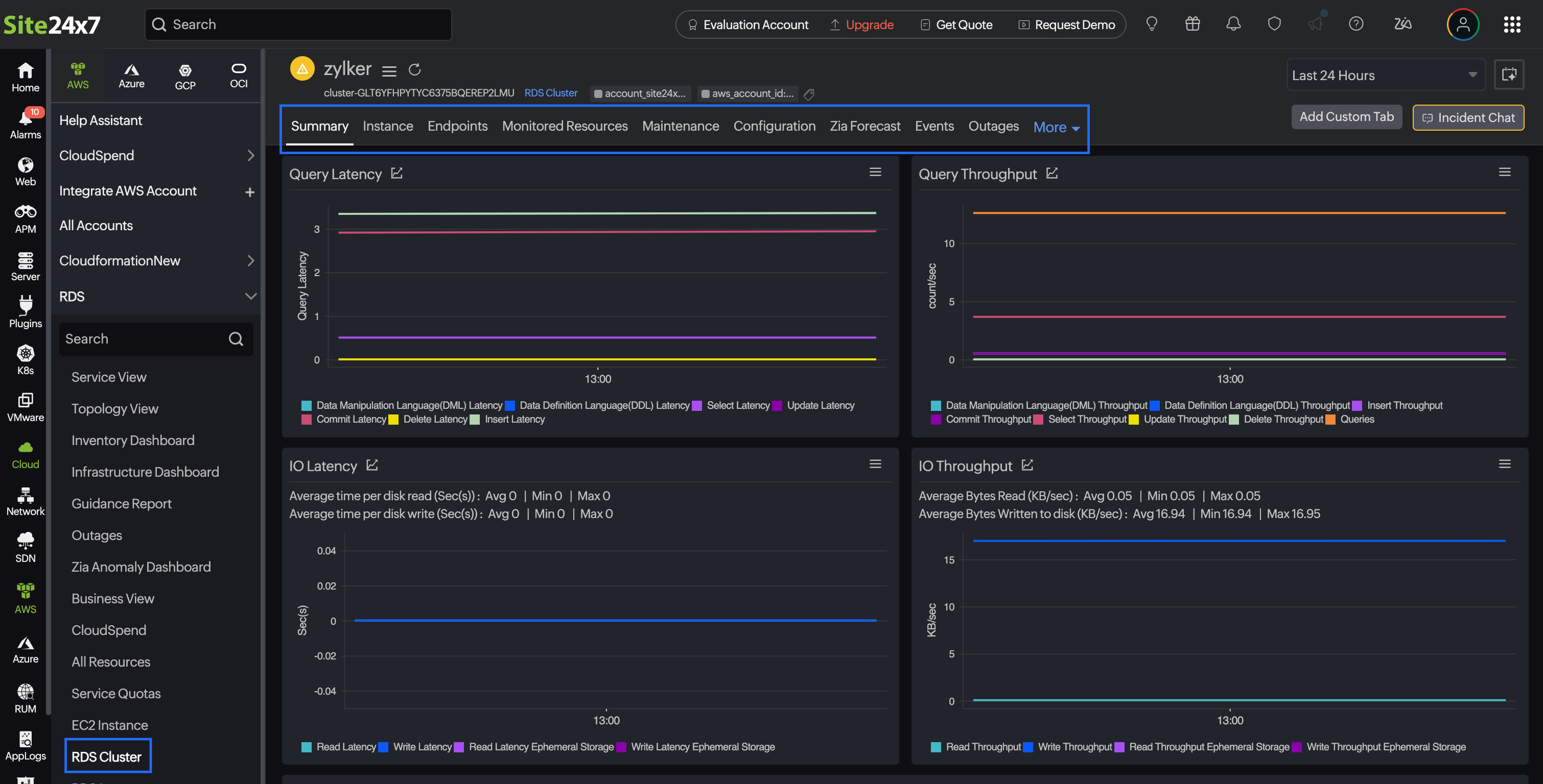 Amazon's Relational Database Service (RDS) is a managed web service that lets you deploy and scale SQL data stores in the cloud with ease. With Site24x7's RDS integration you can monitor metrics like CPU utilization, CPU credit usage, burst balance, read/write IOPS, database connections, network throughput and more for each active relational database instance. All RDS engine types are supported.