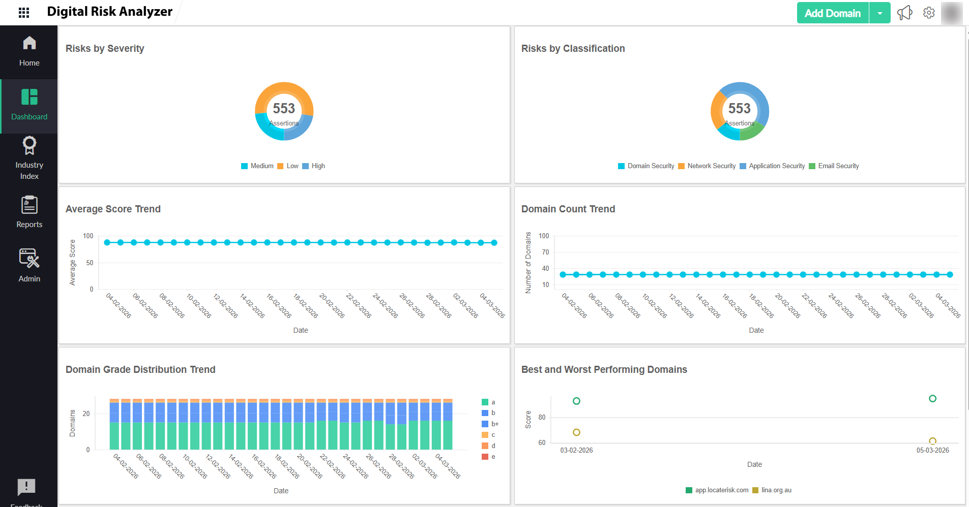 The Digital Risk Analyzer dashboard provides a centralized view of your organization’s digital risk posture. It consolidates key insights across domains and presents them through intuitive charts and widgets, making it easier to track security scores, identify trends, spot recurring risks, and understand how your domains perform over time.