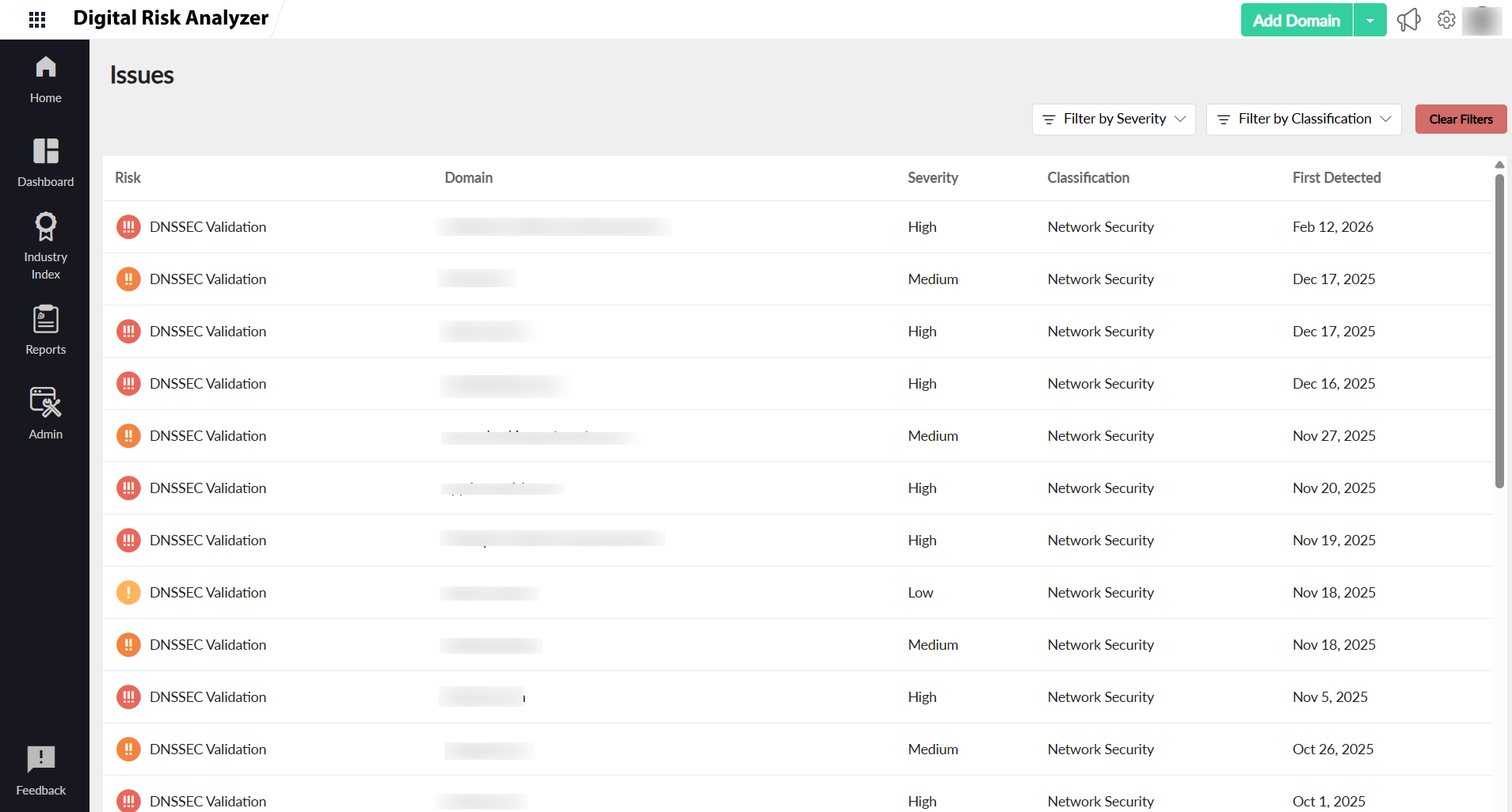 The Risks page provides a consolidated view of all identified security and configuration risks across your monitored domains. Each risk entry includes details such as the affected domain, severity level, classification type, and the date it was first detected. This helps you quickly assess, prioritize, and track issues.
