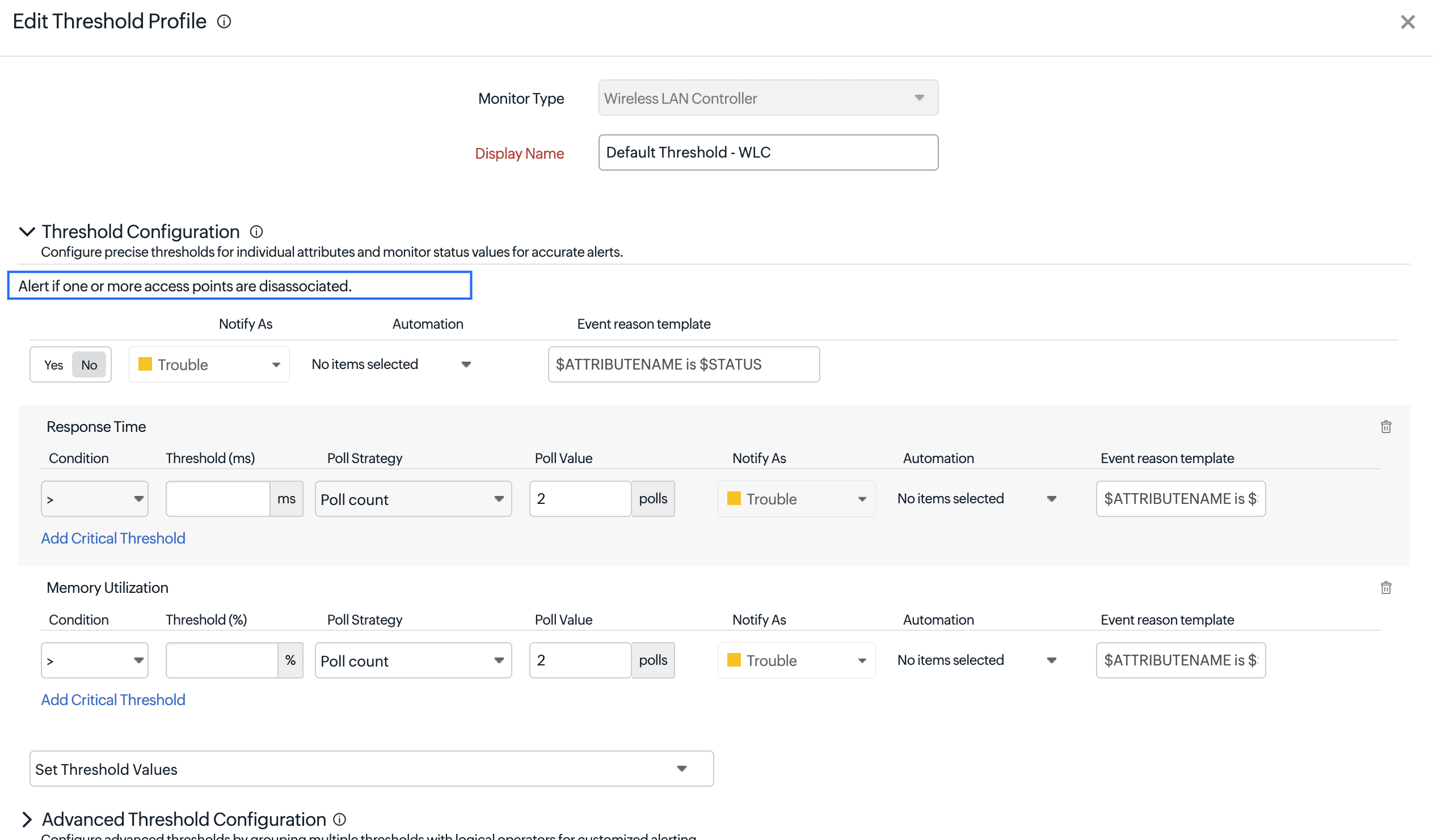 You can configure a threshold alert to notify you when access points become unmapped. Site24x7 allows you to detect when access points become disassociated from the WLC.
