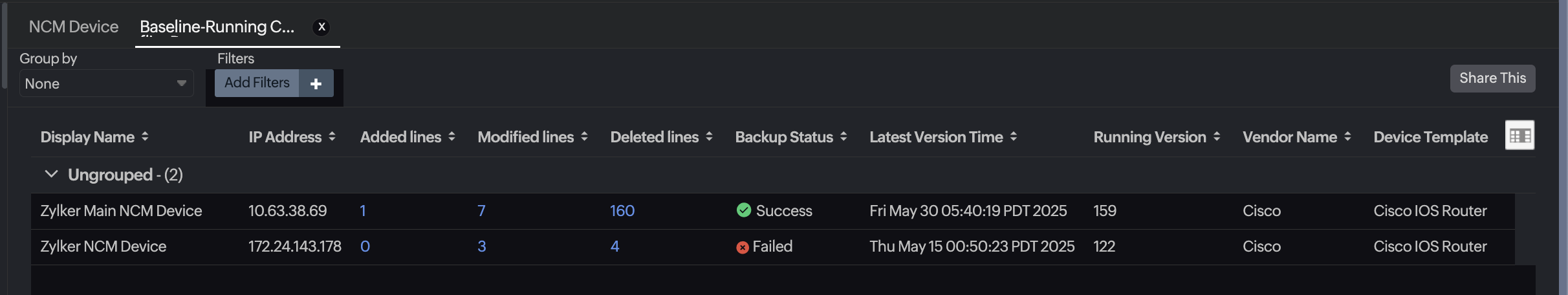Modified Lines The total count of modified lines in the baseline running configuration compared with the current running version
