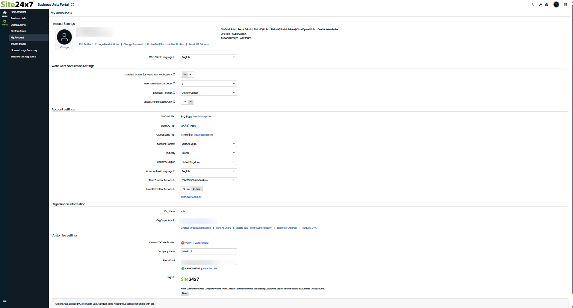 - Change Organization Name: You can contact Site24x7 support to update the name of your organization.